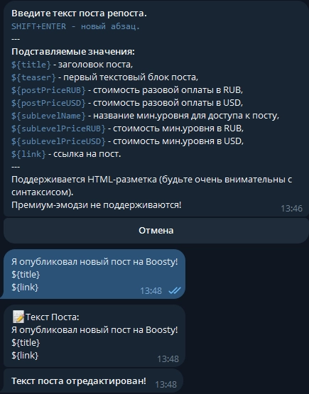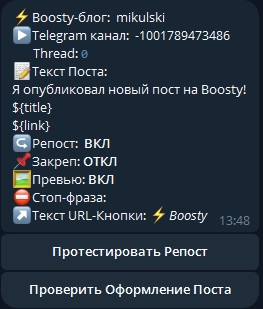 - Для оформления репостов доступны HTML-разметка, «подтягивание» изображения из поста в качестве превью, ряд текстовых переменных и возможность менять текст URL-кнопки ведущей на пост Boosty;