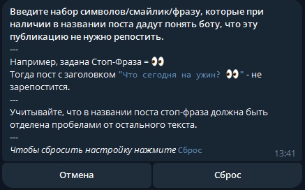 В случае, если вы не хотите репостить все публикации подряд, то можно придумать комбинацию символов или смайлик для заголовка, которые дадут боту знать, что этот пост следует проигнорировать.