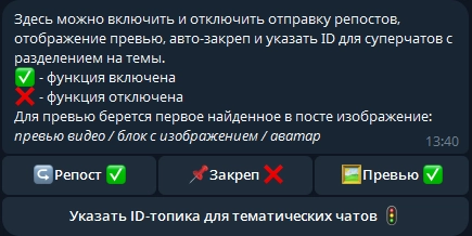 Эта кнопка вызывает подменю, в котором можно включить/выключить репост, превью, авто-закреп и указать ветку/топик для чатов с разделением на темы.
