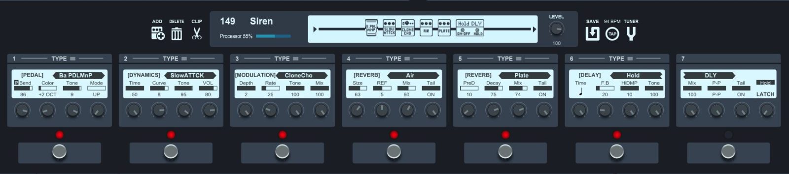 - BA PDLPit – pitch shifter assigned to an optional expression pedal: depending on the position of the pedal, it lowers/raises the octave of the note.